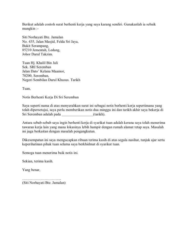 Walau apa pun alasannya, kita mesti berhenti kerja cara baik. Jadi, boleh ikuti contoh surat perletakan jawatan ini. Namun, jika lebih selesa dalam english, dapat contoh surat berhenti kerja dalam bahasa inggeris. Di sini dikongsikan surat berhenti . Contoh surat rasmi berhenti kerja bahasa melayu dan bahasa inggeris. Format surat rasmi berhenti kerja. Berikut adalah contoh surat rasmi berhenti kerja dalam bahasa melayu yang merangkumi notis perletakan jawatan sama ada dalam 24 jam atau sebulan. Salinan surat perjanjian sebelum berhenti kerja.